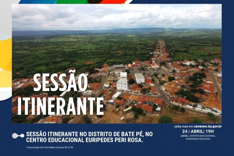 Nesta quarta-feira, 24, a Câmara Municipal de Vitória da Conquista realiza Sessão Itinerante no Distrito de Bate Pé às 19h. A sessão será realizada no Centro Educacional Eurípedes Peri Rosa, sendo aberta à população.Durante a sessão, os vereadores ap…