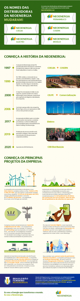 | Sobre a Neoenergia: Companhia de capital aberto com ações (NEOE3) negociadas na Bolsa de Valores de São Paulo. Parte do grupo espanhol Iberdrola, a empresa atua no Brasil desde 1997, sendo atualmente uma das líderes do setor elétrico do país. Presente em 18 estados e no Distrito Federal, seus negócios estão divididos nas áreas de geração, transmissão, distribuição e comercialização. As suas distribuidoras, Neoenergia Coelba (BA), Neoenergia Pernambuco (PE), Neoenergia Cosern (RN), Neoenergia Elektro (SP/MS) e Neoenergia Brasília (DF) atendem a mais de 15 milhões de clientes, o equivalente a uma população superior a 37 milhões de pessoas.A Neoenergia possui 4 GW de capacidade instalada em geração, sendo 88% de energia renovável, e está implementando mais 1 GW com a construção de novos parques eólicos. Em transmissão, são 1,4 mil km de linhas em operação e 5,3 mil km em construção. Por meio do Instituto Neoenergia, fomenta o desenvolvimento sustentável a partir de ações socioambientais e, assim, contribui para a melhoria da qualidade de vida das comunidades onde a empresa atua, sobretudo, pessoas mais vulneráveis, visando sempre pelo desenvolvimento sustentável. A companhia é primeira empresa no País a patrocinar exclusivamente a Seleção Brasileira de Futebol Feminino, dando nome à competição nacional, que passa a se chamar Brasileirão Feminino Neoenergia. Desde janeiro 2021, integra a carteira do Índice de Sustentabilidade Empresarial da B3 – Brasil, Bolsa, Balcão – que reúne companhias que possuem as melhores práticas de governança e sustentabilidade corporativa. |