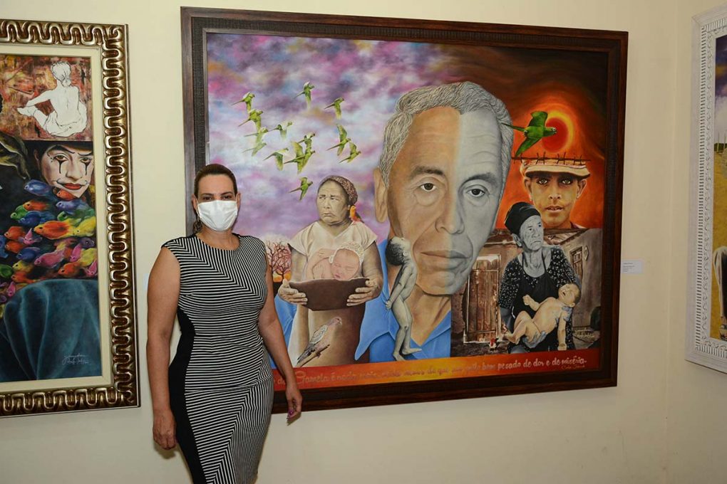 Prefeita Sheila Lemos e a artista plástica Valéria Vidigal observam um dos quadros da autora.