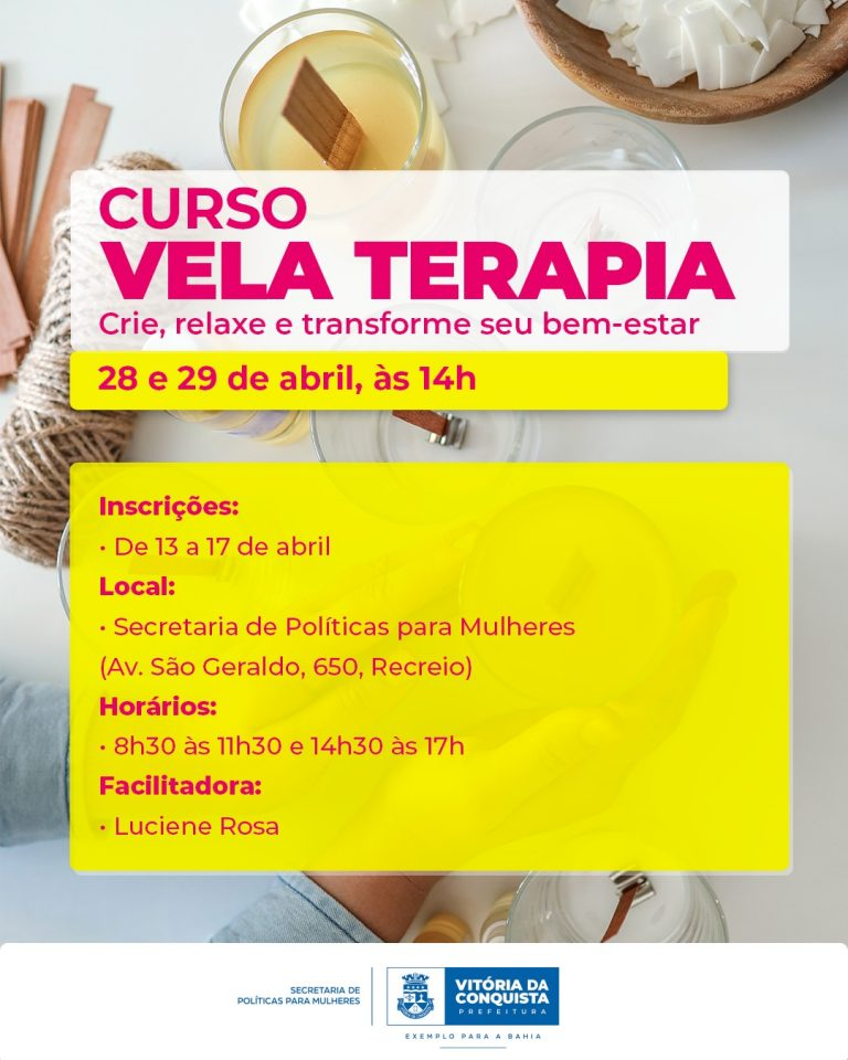 Entre os dias 13 e 17 de abril, a Secretaria Municipal de Políticas para Mulheres (SMPM) realizará inscrições para o curso de velas.