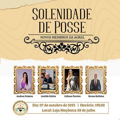 A Academia Grapiúna de Artes e Letras (Agral) realiza, nesta terça-feira, 7 de outubro, às 19h30, uma sessão solene de posse de novos acadêmicos, na Loja Maçônica 28 de Julho, em Itabuna.