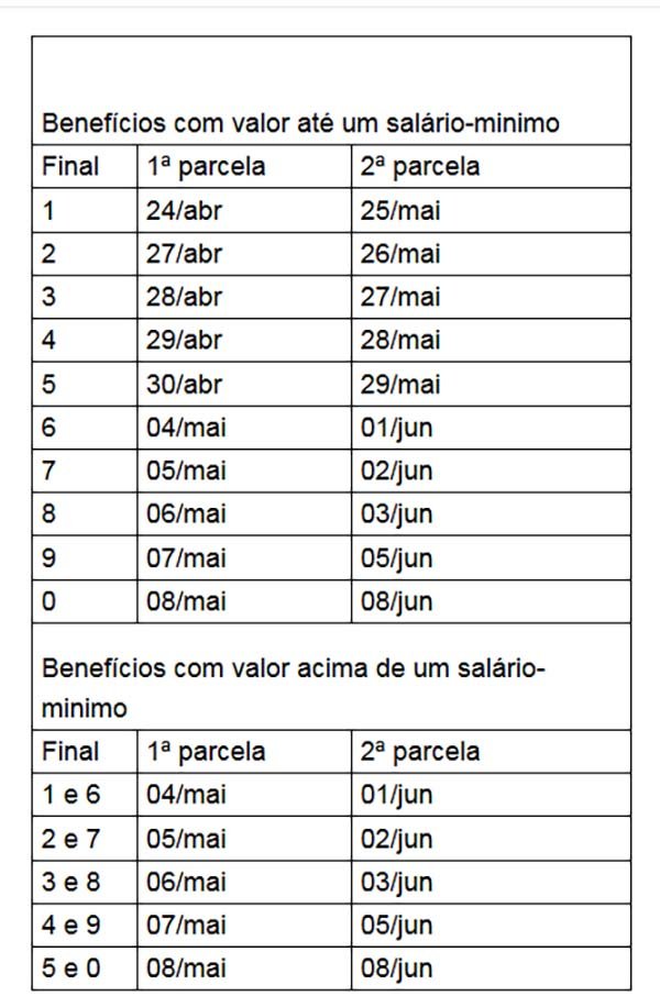 O calendário de pagamento da primeira parcela vai de 24 de abril até 8 de maio. A segunda metade do 13º será paga de 25 de maio a 8 de junho. A data de pagamento leva em conta o número final do cartão de benefício, sem considerar o último dígito verificador, que aparece depois do traço.