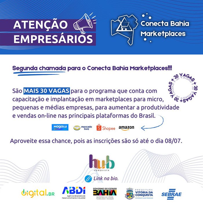 O Hub Conquista está oferecendo uma segunda chance incrível para você se inscrever no nosso programa de sucesso, com +30 vagas extras para o Conecta Bahia Marketplaces!