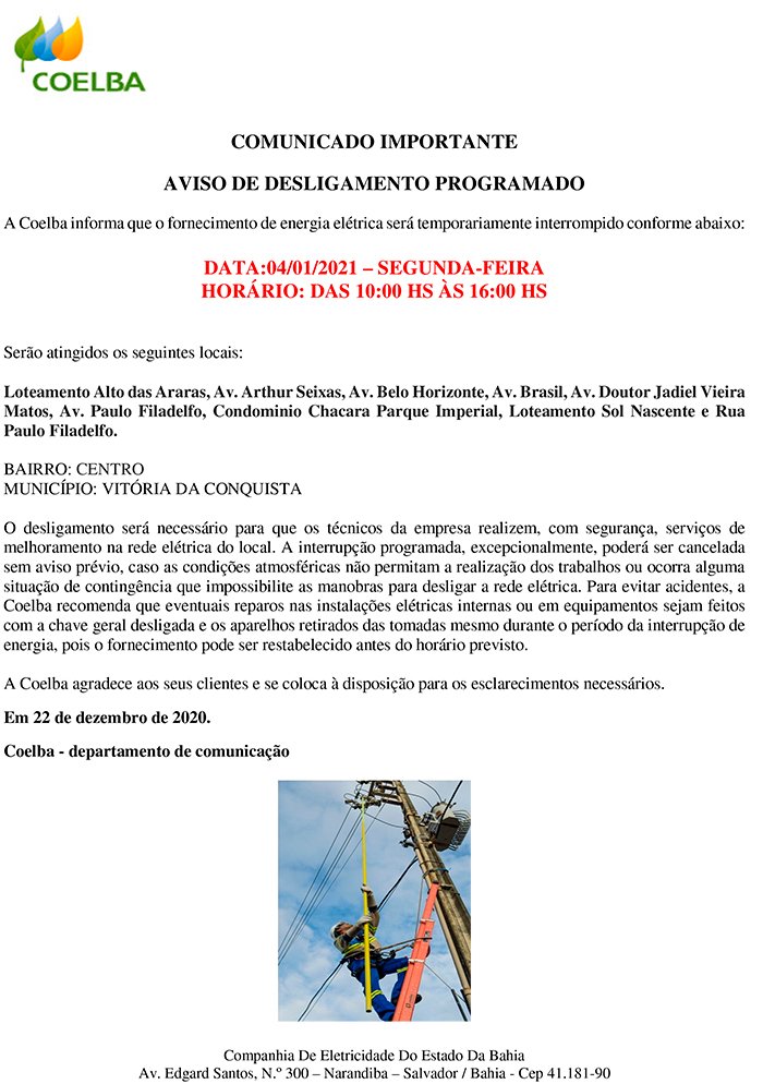 Aviso de desligamento programado da Coelba para Vitória da Conquista 28 de dezembro de 2020 Destaques, SudoesteImagem: Se Liga Alagoinhas Compartilhe: Clique para imprimir(abre em nova janela) Imprimir Clique para compartilhar no Facebook(abre em nova janela) Facebook Clique para compartilhar no Reddit(abre em nova janela) Reddit Clique para compartilhar no WhatsApp(abre em nova janela) WhatsApp Clique para compartilhar no X(abre em nova janela) 18+ Clique para enviar um link por e-mail para um amigo(abre em nova janela) E-mail Clique para compartilhar no Telegram(abre em nova janela) Telegram Relacionado DestaqueDestaque-HomeDestaques