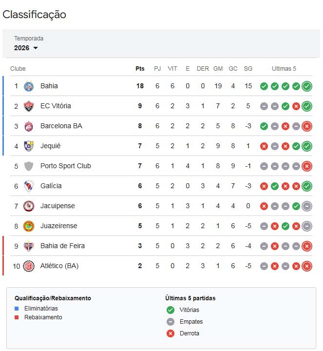 A sexta rodada do Campeonato Baiano série A, masculino, 2026, teve dois jogos neste domingo, 01. O Bahia venceu o Porto por três tentos a um. O Vitória também venceu: 2 x 0 Barcelona.