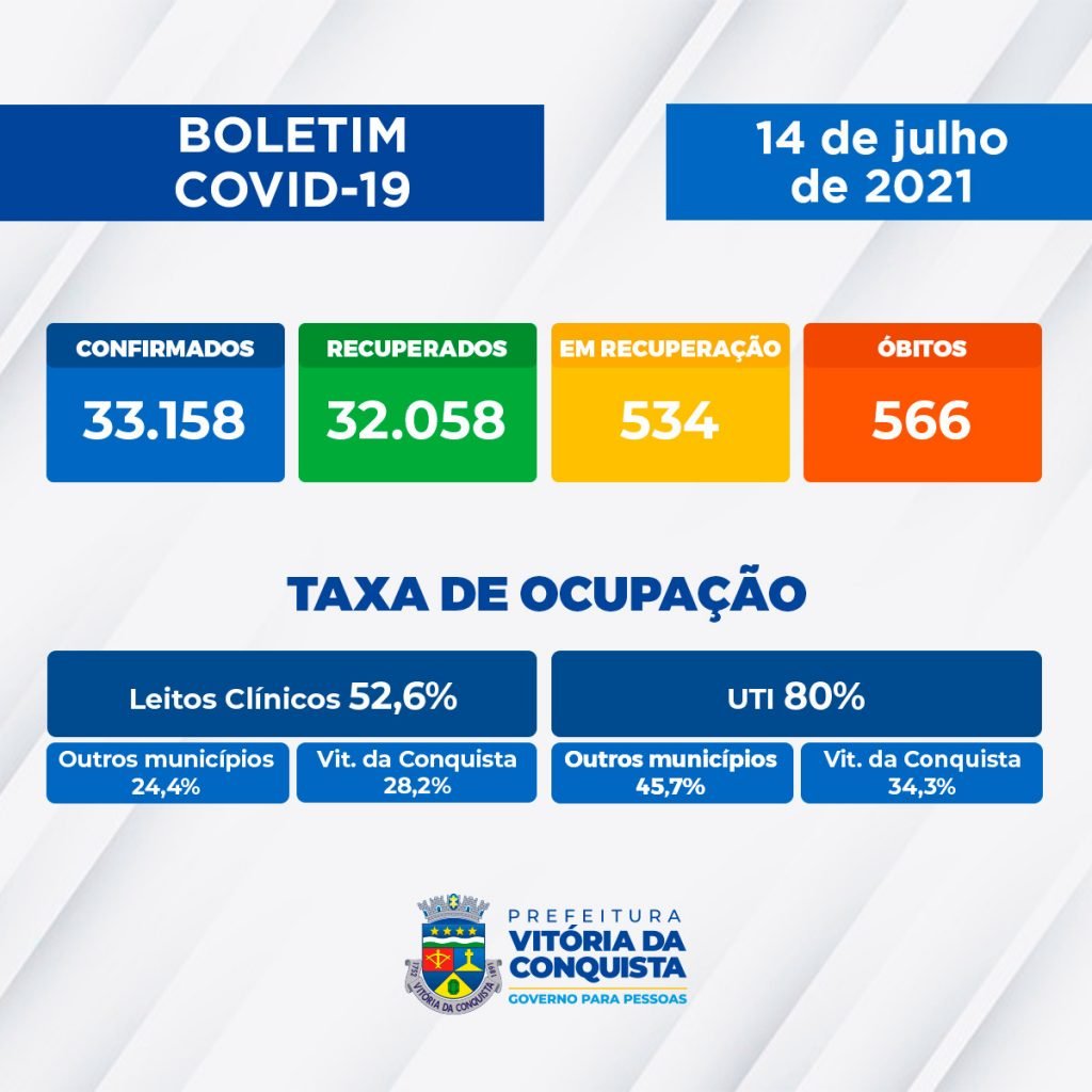 O boletim epidemiológico da Secretaria Municipal de Saúde (SMS), desta quarta-feira (14), informou 141 novos casos da Covid-19, totalizando 33.158 casos confirmados em Vitória da Conquista desde o início da pandemia. Das pessoas que tiveram diagnóstico positivo para a doença, 32.058 estão recuperadas e outras 534 seguem em recuperação, 63 deles internados e 471 em tratamento domiciliar.