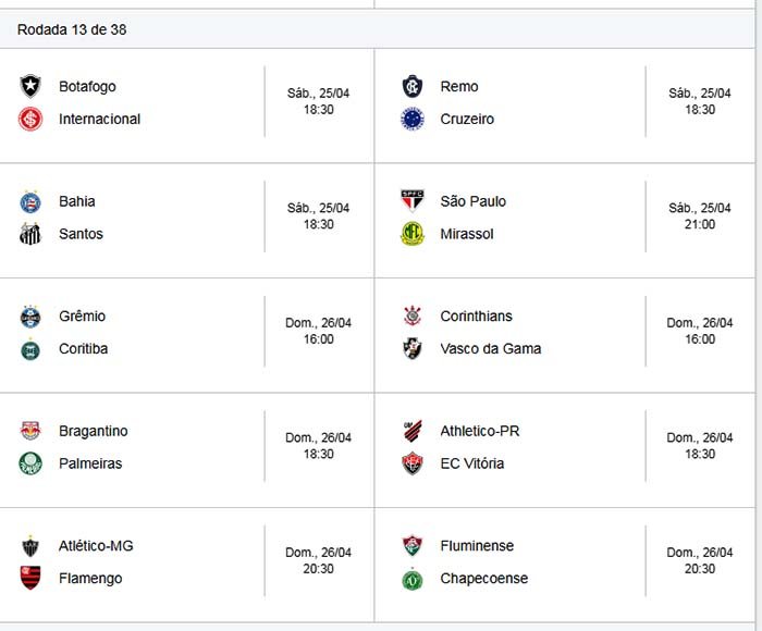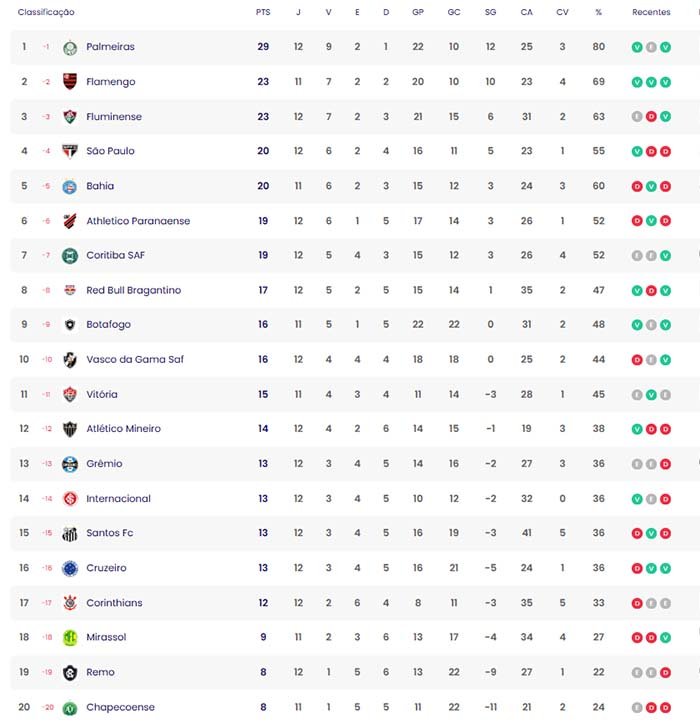 Já neste domingo, fechando a rodada, lém de Bahia x Flamengo, tivemos, Internacional 1 X Mirassol 2, Coritiba 2 x 0 Atletico Mineiro, Santos 2 x 3 Fluminense, Palmeiras 1 x 0 Atlético Paranaense e Bragantino 4 x 2 Remo.