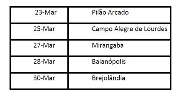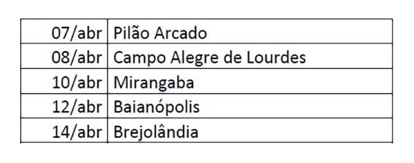 A primeira parada será em Pilão Arcado, na próxima segunda-feira, no dia 23 de março.