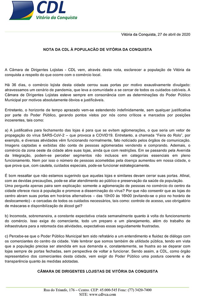 A Câmara de Dirigentes Lojistas de Vitória da Conquista – CDL, emitiu nota à população esclarecendo situações adversas envolvendo o funcionamento do comércio na cidade. Eis a íntegra da nota:
