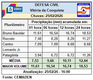 A Prefeitura de Vitória da Conquista intensificou o monitoramento e as ações de contingência em resposta às chuvas contínuas que atingem o município.