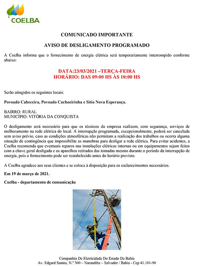 COELBA: Desligamento de energia em Conquista nesta quarta-feira, 24.03