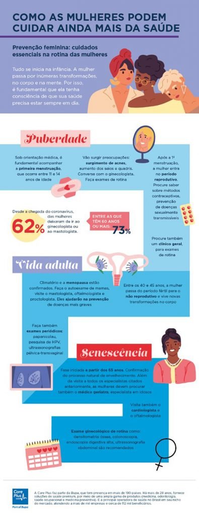 Neste Dia Internacional da Mulher, a Careplus, operadora de saúde premium, compartilha infográfico com dicas de como as mulheres podem cuidar ainda mais da saúde, desde a puberdade, passando pela vida adulta e senescência.