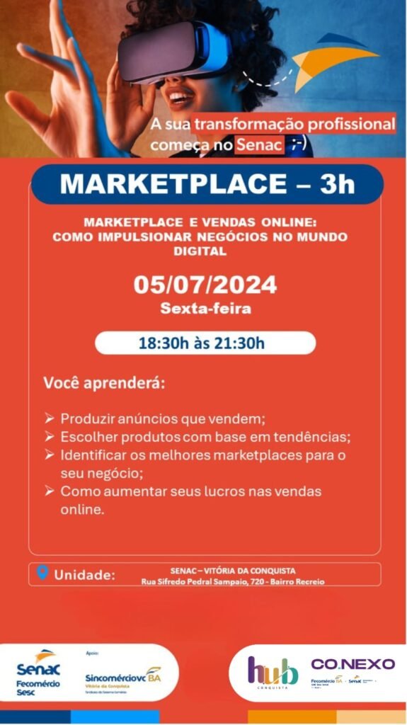 Quer conhecer mais sobre marketplace e vendas online para impulsionar seu negócio no mundo digital? Não perca nossa oficina Marketplace e Vendas Online: Como Impulsionar Negócios no Mundo Digital! 📣📢