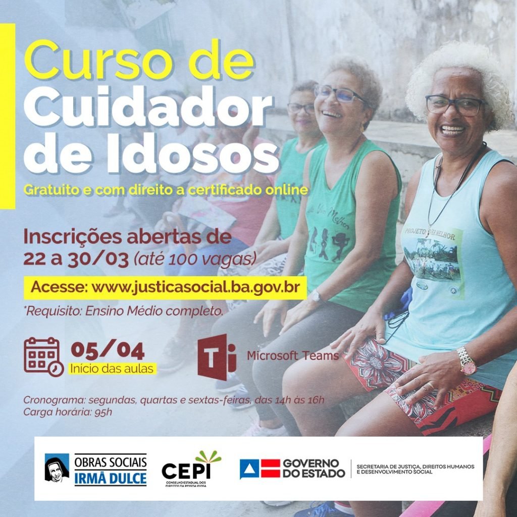 Estão abertas as inscrições para o Curso de Cuidador de Idosos, promovido pelo Conselho Estadual da Pessoa Idosa (CEPI), vinculado à Secretaria de Justiça, Direitos Humanos e Desenvolvimento Social da Bahia (SJDHDS), e pelas Obras Sociais Irmã Dulce.