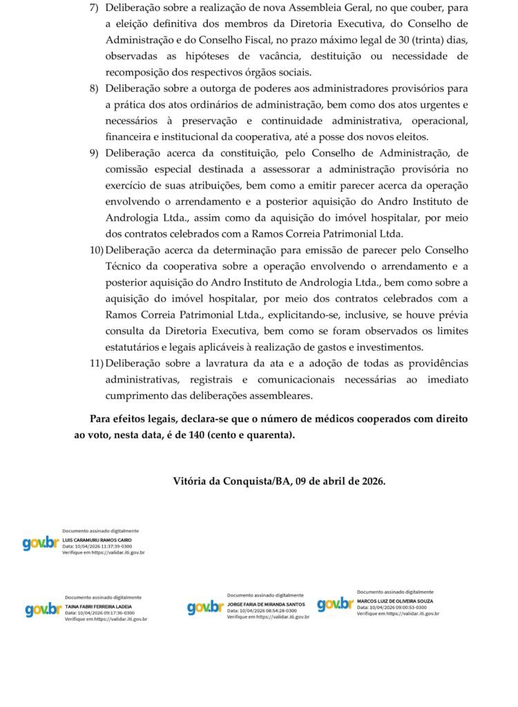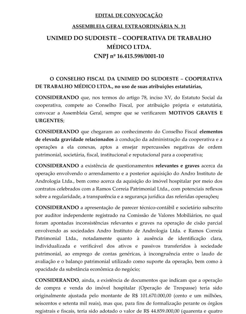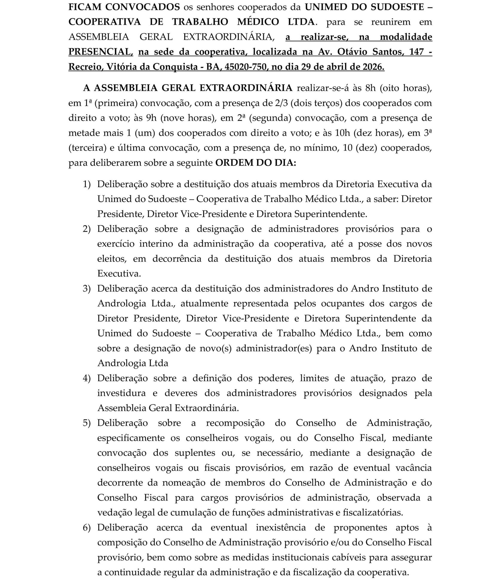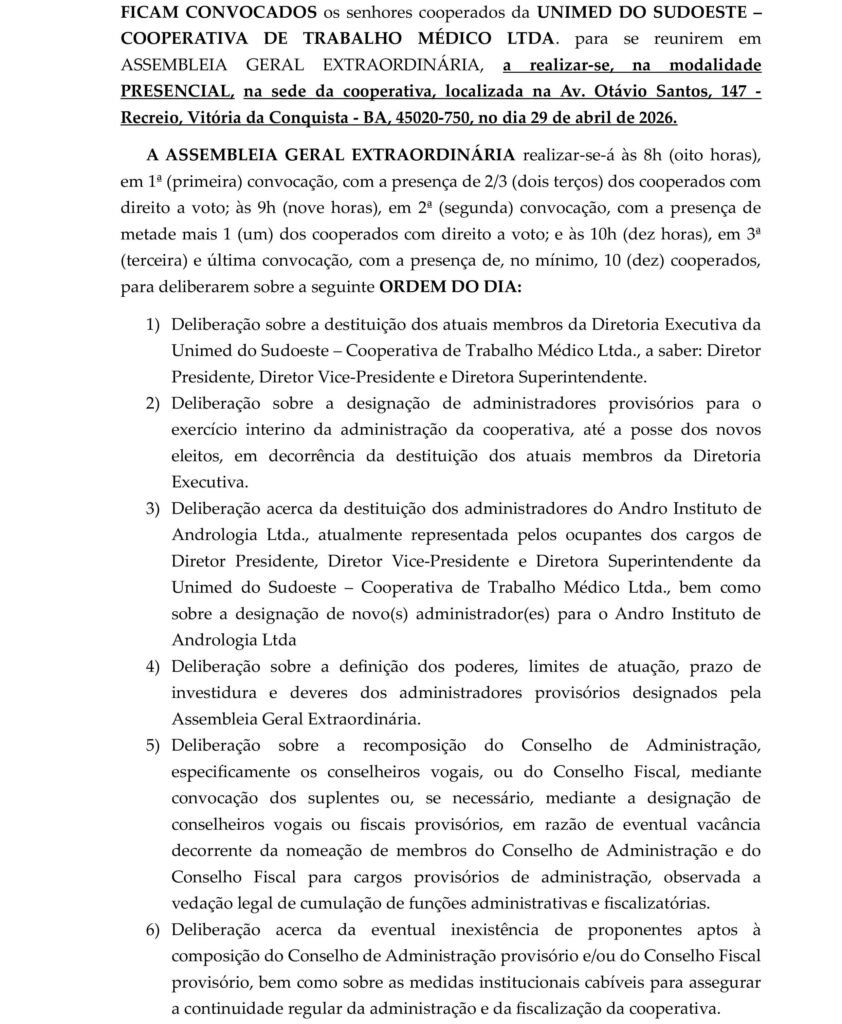 Conselho Fiscal da Unimed do Sudoeste convoca cooperados: Assembleia Geral Extraordinária 10 de abril de 2026 Sem categoriaCompartilhe: Imprimir(abre em nova janela) Imprimir Compartilhar no Facebook(abre em nova janela) Facebook Compartilhar no Reddit(abre em nova janela) Reddit Compartilhar no WhatsApp(abre em nova janela) WhatsApp Compartilhar no X(abre em nova janela) 18+ Envie um link por e-mail para um amigo(abre em nova janela) E-mail Compartilhar no Telegram(abre em nova janela) Telegram Relacionado
