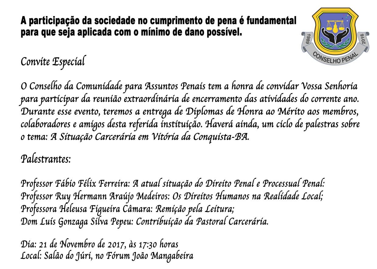 Conselho Penal realiza homenagens a veteranos da instituição 18 de novembro de 2017 Destaques, Sudoeste Nesta terça-feira, 21, o Conselho da Comunidade Para Assuntos Penais realiza homenagens a todos os conselheiros que contribuem para a existência e o fortalecimento do órgão. Várias autoridades também abrilhantarão o evento. Veja o convite: Compartilhe: Clique para imprimir(abre em nova janela) Imprimir Clique para compartilhar no Facebook(abre em nova janela) Facebook Clique para compartilhar no Reddit(abre em nova janela) Reddit Clique para compartilhar no WhatsApp(abre em nova janela) WhatsApp Clique para compartilhar no X(abre em nova janela) 18+ Clique para enviar um link por e-mail para um amigo(abre em nova janela) E-mail Clique para compartilhar no Telegram(abre em nova janela) Telegram Relacionado DestaqueDestaque-HomeDestaques