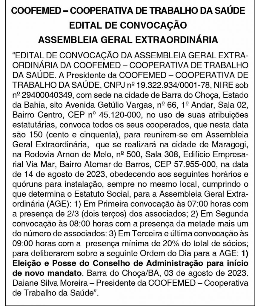 Convocação de Assembleia Geral Extraordinária publicada na versão impressa de 03 de agosto