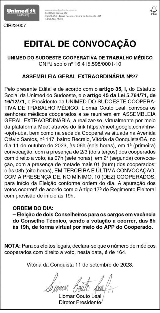 Convocação de Assembleia Geral Extraordinária publicada na versão impressa de 11 de setembro