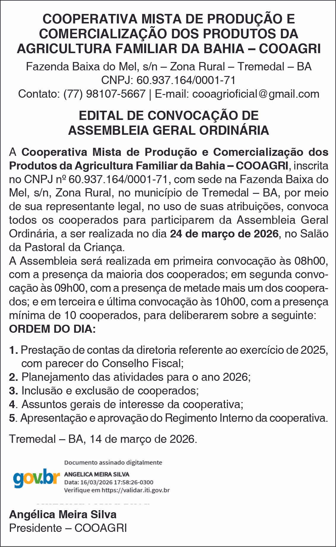 COOAGRI convoca cooperados para Assembleia Geral Ordinária