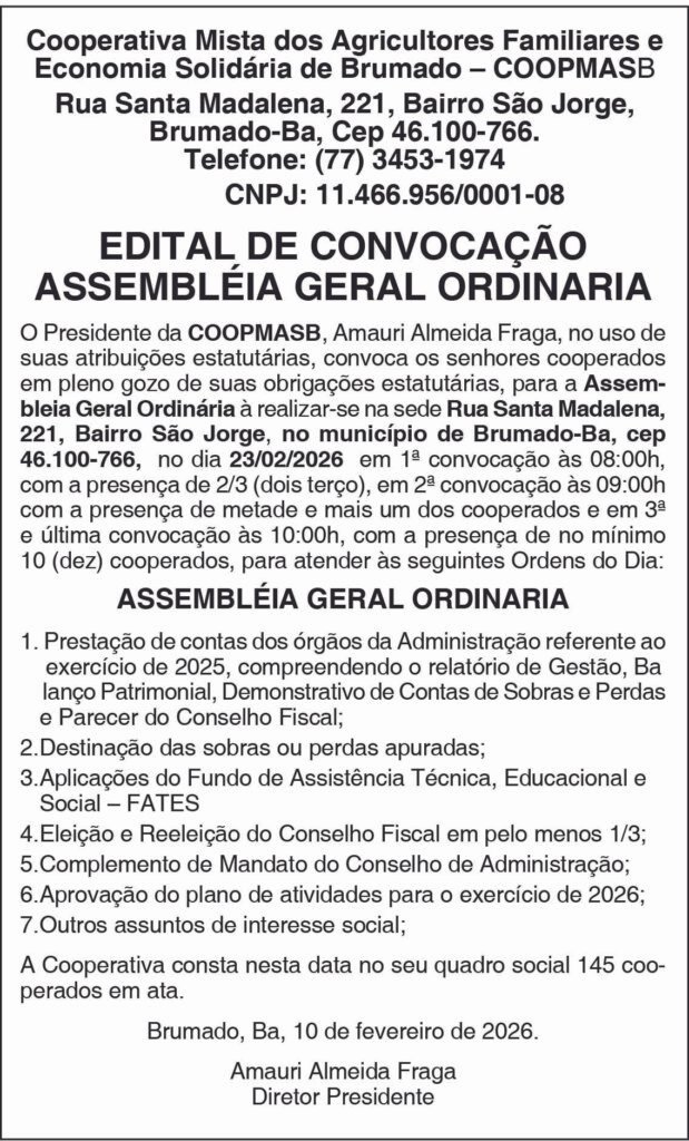 COOPMASB convoca cooperados para Assembleia Geral Ordinária