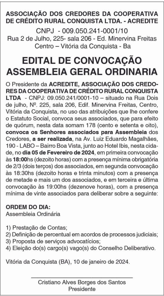 Editais publicados na edição impressa do jornal Diário do Sudoeste da Bahia do dia 10.01.2024