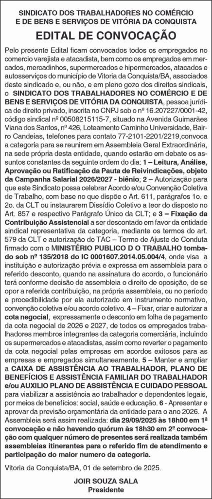 Edital de Convocação de AGE do Sindicato dos Trabalhadores o Comércio e de Bens e Serviços de Vitória da Conquista