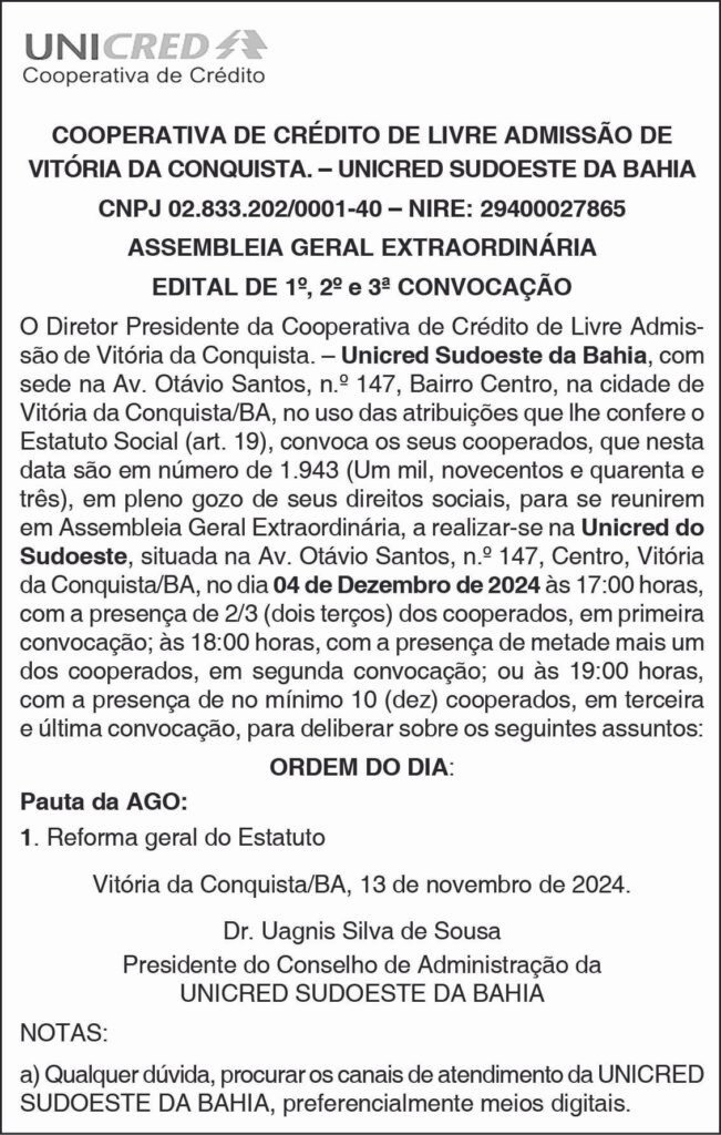Edital de Convocação de Assembleia Geral Extraordinária da Unicred Sudoeste da Bahia 14 de novembro de 2024 Bahia, Destaques, Mundo, Noticias, SudoesteEdital de Convocação de Assembleia Geral Extraordinária da Unicred Sudoeste da Bahia, publicado na versão impressa do jornal Diário do Sudoeste da Bahia edição nº 6560 do dia 14 de novembro de 2024. Compartilhe: Clique para imprimir(abre em nova janela) Imprimir Clique para compartilhar no Facebook(abre em nova janela) Facebook Clique para compartilhar no Reddit(abre em nova janela) Reddit Clique para compartilhar no WhatsApp(abre em nova janela) WhatsApp Clique para compartilhar no X(abre em nova janela) 18+ Clique para enviar um link por e-mail para um amigo(abre em nova janela) E-mail Clique para compartilhar no Telegram(abre em nova janela) Telegram Relacionado Assembleia Geral ExtraordináriaConvocaçãoDestaqueDestaque-HomeDestaquesEditalUnicred Sudoeste da Bahia