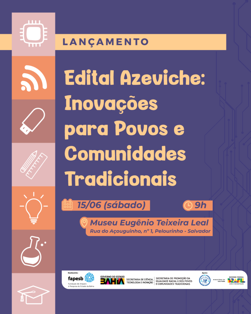 A Secretaria de Promoção da Igualdade Racial e dos Povos e Comunidades Tradicionais (Sepromi) e a Secretaria de Ciência, Tecnologia e Inovação (Secti), por meio da Fundação de Amparo à Pesquisa do Estado da Bahia (Fapesb), lançam, neste sábado (15), às 9h, no Museu Eugênio Teixeira Leal, no Pelourinho, o Edital Azeviche: Inovações para Povos e Comunidades Tradicionais.