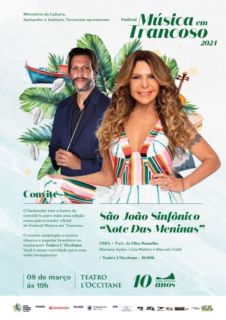 No quinto dia de apresentações, o Festival Música em Trancoso recebe a Orquestra Sinfônico da Bahia e as cantoras Elba Ramalho e Mariana Aydar em programação do Dia da Mulher