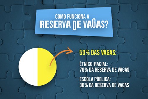 Isso se dá porque na categoria de concorrência “Reserva de Vagas”, 70% do total de vagas é destinado a estudantes que se autodeclarem negros e que sejam oriundos da rede pública de ensino. Os outros 30% são voltados para candidatos que comprovarem ter estudado, no mínimo, sete anos em instituições públicas de ensino.