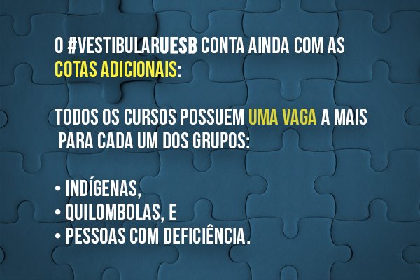 Para concorrer tanto na “Reserva de Vagas” como nas “Cotas Adicionais”, é necessário não ser portador de diploma de graduação. Toda a distribuição das vagas disponíveis em cada curso de graduação, por modalidade de concorrência, obedece a Política de Ações Afirmativas, implementada na Uesb por meio das Resoluções do Conselho Superior de Ensino, Pesquisa e Extensão (Consepe), desde o ano de 2008.
