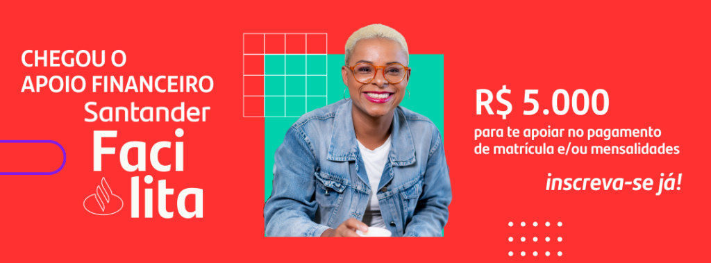O programa Santander Facilita 2023, uma iniciativa do Santander Universidades, chega em seus últimos dias de inscrições. O programa vai dar bolsas de estudo de R$ 5 mil para mil alunos de graduação e pós-graduação de universidades particulares conveniadas. O valor será pago diretamente à instituição de ensino do universitário em março de 2024 e deverá ser direcionado para realizar o abatimento das mensalidades, rematrícula do curso vigente ou pagamento de débitos em atraso.