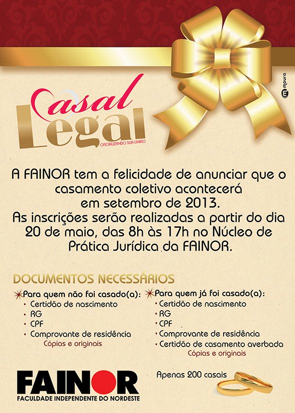 O Projeto Casal Legal tem como objetivo regularizar a situação civil de casais que já vivem juntos ou desejam se casar. Para participar, é necessário ir ao Núcleo de Prática Jurídica da FAINOR, na Av. São Geraldo, Praça Santo Antônio, 78, Bairro Recreio. Documentos, cópias e originais, a serem apresentados: