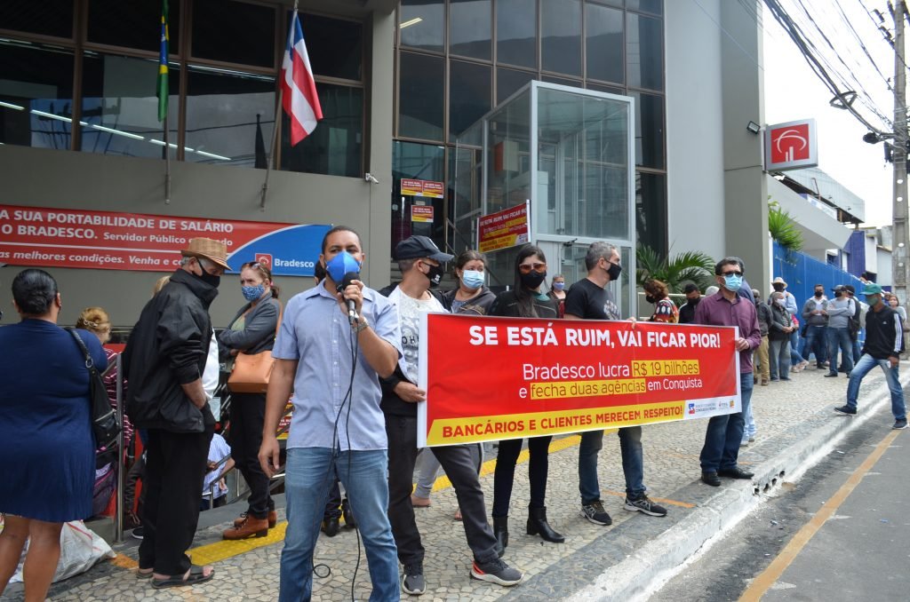 Na manhã desta segunda-feira (26), o Sindicato dos Bancários de Vitória da Conquista e Região protestou contra o fechamento das agências Bradesco Maximiliano Fernandes e Shopping Conquista Sul.