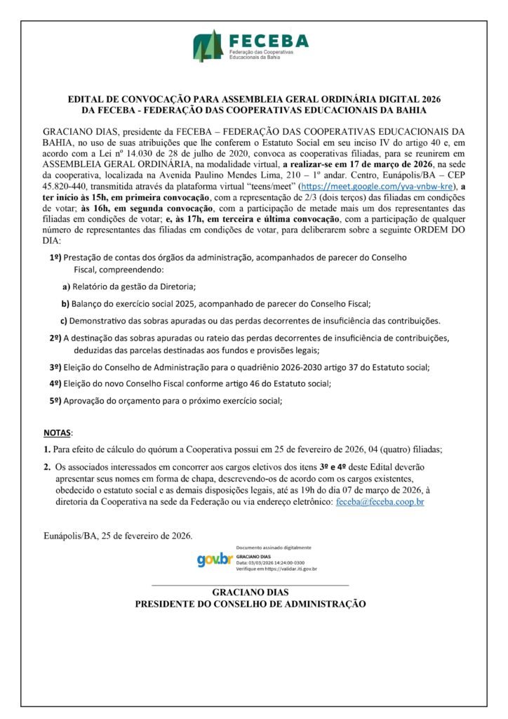 Federação das Cooperativas Educacionais da Bahia convoca cooperados