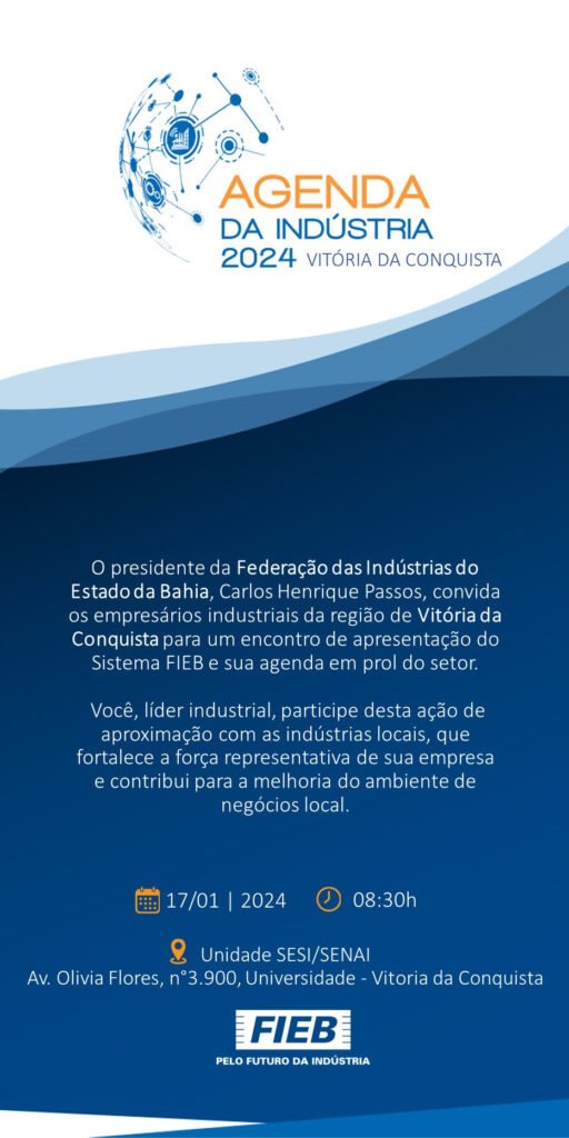 FIEB realiza encontro com industriários em Vitória da Conquista dia 17 de janeiro 5 de janeiro de 2024 Bahia, Destaques, Entretenimento, SudoesteO objetivo do encontro é anunciar as metas da agenda 2024 para o setor das indústrias do Região Sudoeste do Estado, fortalecendo o vínculo entre as lideranças empresariais. Compartilhe: Clique para imprimir(abre em nova janela) Imprimir Clique para compartilhar no Facebook(abre em nova janela) Facebook Clique para compartilhar no Reddit(abre em nova janela) Reddit Clique para compartilhar no WhatsApp(abre em nova janela) WhatsApp Clique para compartilhar no X(abre em nova janela) 18+ Clique para enviar um link por e-mail para um amigo(abre em nova janela) E-mail Clique para compartilhar no Telegram(abre em nova janela) Telegram Relacionado DestaqueDestaque-HomeDestaques