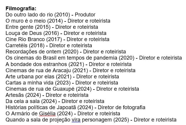 Atua como diretor, produtor e roteirista dos filmes “Cinemas de Rua de Aracaju” e “Arte Urbana por Elas”. Além disso, foi coordenador e formador em audiovisual no projeto “Curso Virtual de Realização Audiovisual no Recôncavo”.