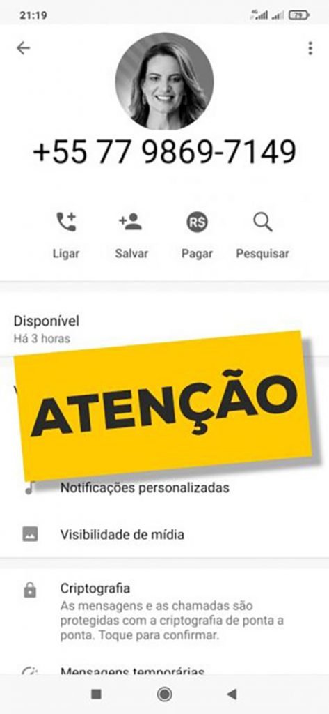 Pessoa ainda não identificada está usando uma foto pública da prefeita Sheila Lemos, retirada da Internet, em um número falso de Whatsapp, e tenta aplicar golpes usando o nome dela.
