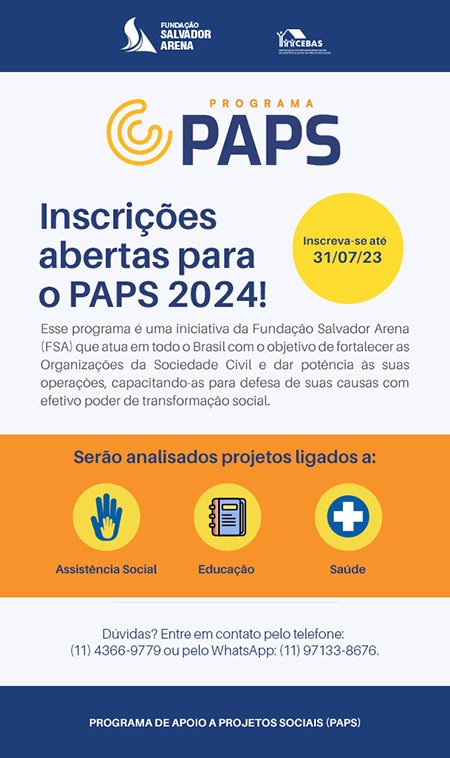 A Fundação Salvador Arena anuncia a abertura das inscrições para o Programa de Apoio a Projetos Sociais – PAPS 2024, edital que seleciona projetos de Organizações da Sociedade Civil (OSCs) para receberem assessoria técnica e recursos financeiros para a execução.