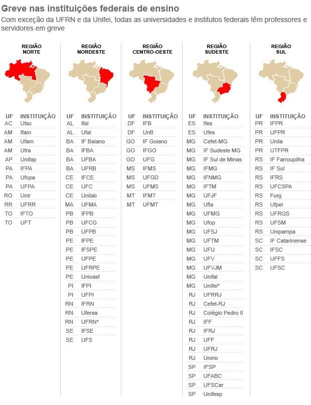 Já o Sindicato Nacional dos Docentes das Instituições de Ensino Superior (Andes) e ao Sindicato Nacional dos Servidores Federais da Educação Básica Profissional e Tecnológica (Sinasefe) dizem que representam 65 mil docentes em quase todas as 59 universidades, 40 institutos de educação tecnológica e o Colégio Pedro II, no Rio. Nestas universidades e institutos, assembleias continuam rejeitando a proposta do governo.