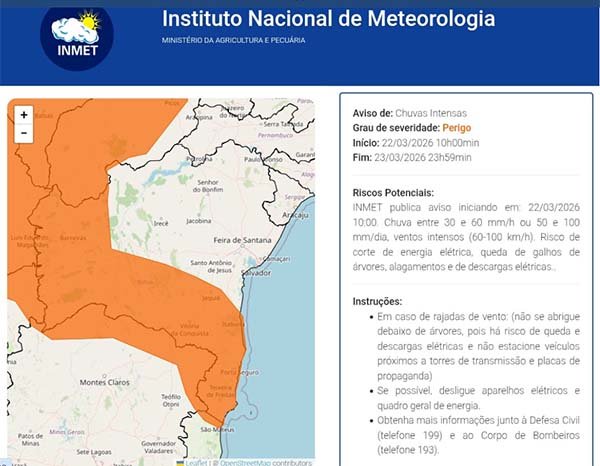 Neste domingo(22), o Instituto Nacional de Meteorologia (Inmet) renovou o alerta amarelo de perigo potencial para chuvas intensas em Vitória da Conquista.