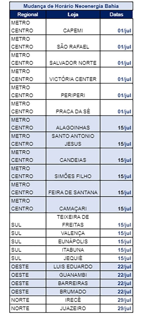 As Lojas de Atendimento ao Cliente da Neoenergia Coelba passarão a ter horário de funcionamento padrão em toda a Bahia.
