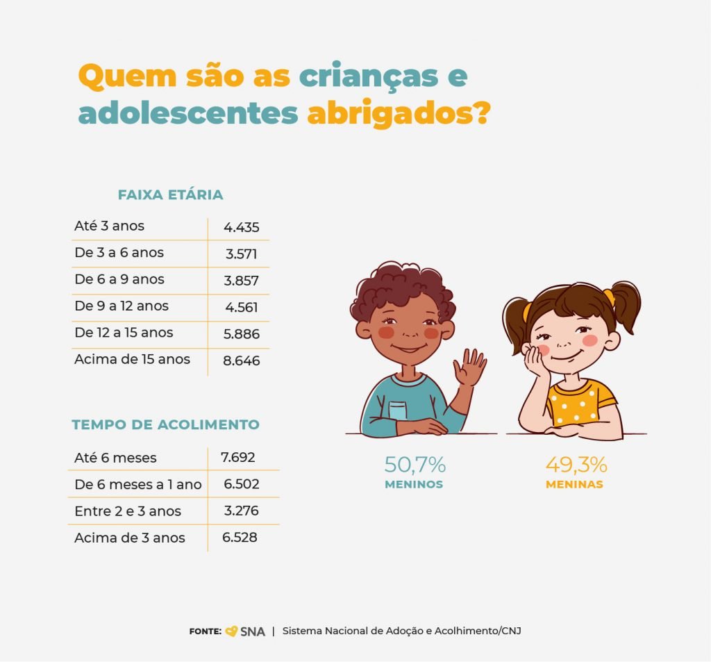 A faixa etária que compõe a maior parte dos abrigados no Brasil são os adolescentes. São 8.643 com mais de 15 anos, sendo mais da metade do sexo masculino. Deste total, 3.142 estão abrigadas há mais de três anos e não têm irmãos nas mesmas condições.