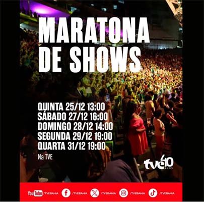 Entre grandes nomes da música brasileira e a força de novos talentos baianos, a TVE entra no clima das festas de fim de ano com uma Maratona de shows que vai ao ar nos dias 25, 27, 28, 29 e 31 de dezembro.