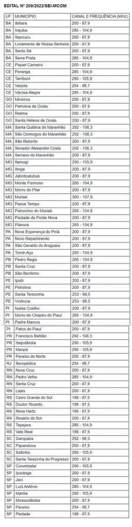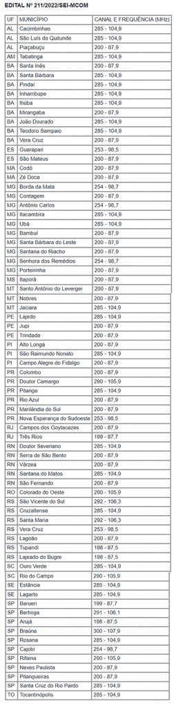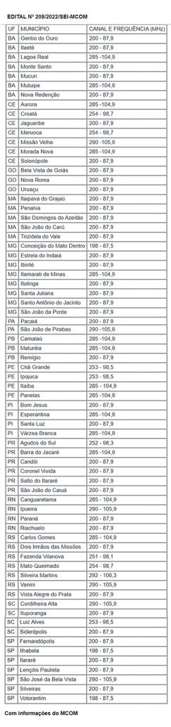 Minas Gerais (28), São Paulo (25), Bahia (22) e Rio Grande do Sul (20) são os estados com mais municípios contemplados. A seleção é publicada pela Secretaria de Radiodifusão (Serad) do Ministério das Comunicações (MCom) e se soma a mais um edital aberto até 30 de janeiro que disponibiliza mais 71 canais em 19 estados.