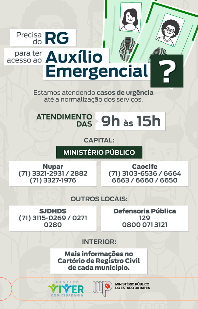 Ministério Público emite RG para acesso ao Auxílio Emergencial em plantão 29 de junho de 2020 Destaques, SudoesteNo interior interessados devem procurar os cartórios de registro civil Compartilhe: Clique para imprimir(abre em nova janela) Imprimir Clique para compartilhar no Facebook(abre em nova janela) Facebook Clique para compartilhar no Reddit(abre em nova janela) Reddit Clique para compartilhar no WhatsApp(abre em nova janela) WhatsApp Clique para compartilhar no X(abre em nova janela) 18+ Clique para enviar um link por e-mail para um amigo(abre em nova janela) E-mail Clique para compartilhar no Telegram(abre em nova janela) Telegram Relacionado DestaqueDestaque-HomeDestaques