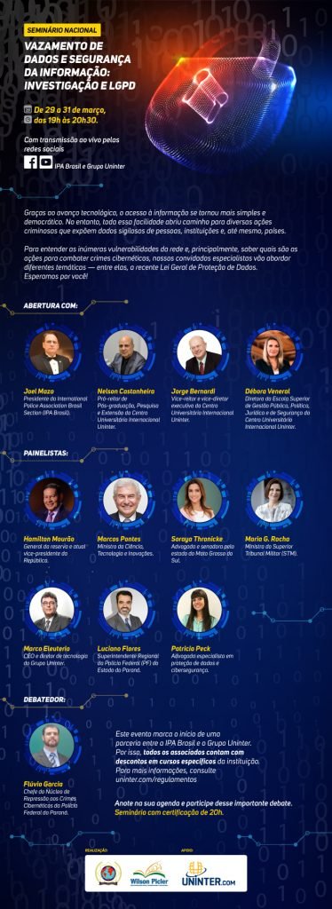 O International Police Association (IPA Brasil), em parceria com a Fundação Wilson Picler e apoio do Centro Universitário Internacional Uninter, realiza entre os dias 29 e 31 de março, um seminário nacional online sobre a proteção de dados no ambiente virtual.