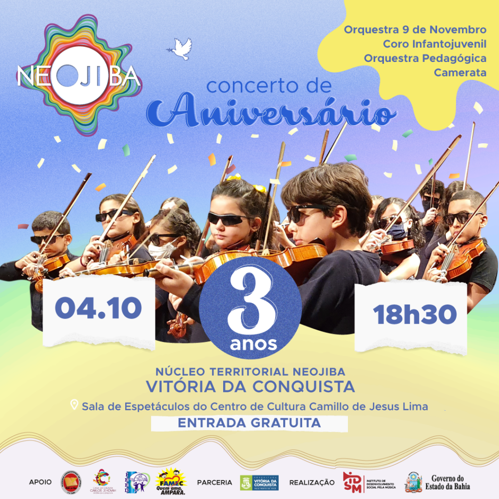 Criado em 2007, o NEOJIBA (Núcleos Estaduais de Orquestras Juvenis e Infantis da Bahia) promove o desenvolvimento e integração social prioritariamente de crianças, adolescentes e jovens em situações de vulnerabilidade, por meio do ensino e da prática musical coletivos.