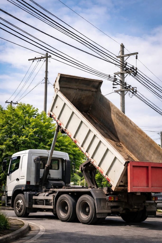 Quando caminhões operam em vias com rede elétrica, é fundamental manter um distanciamento mínimo de 2,5 metros para evitar o risco de contato acidental com cabos energizados, o que pode provocar acidentes graves.