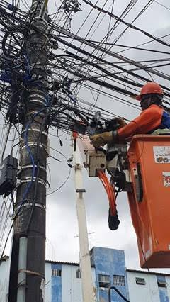 A manutenção dos fios de telefonia e internet é de responsabilidade das operadoras, que são as “donas” dos cabos. A Neoenergia Coelba, porém, mantém um calendário fixo de fiscalização das suas estruturas, removendo situações irregulares quando encontram. Em 2022, 81 toneladas de fiação de telecomunicação foram removidas dos postes da distribuidora e cerca de 16 mil notificações emitidas às empresas.
